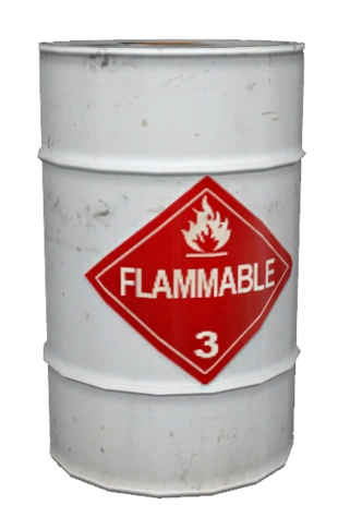- Судя по красной алмазовидной наклейке, в бочке, по всей видимости, содержится бензин, поскольку такие наклейки, согласно министерству транспорта США, наносятся на вещества, относящиеся к 3-му классу опасности (легковоспламеняющиеся жидкости).