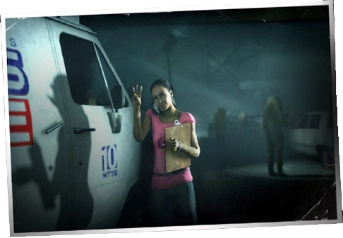 - Исходя из изображения в официальном описании, до эпидемии Рошель работала на некой новостной станции под названием Eyewitness 10 News (название на фургоне). На заднем фоне также можно разглядеть ещё незаражённых агентов АЧС в их костюмах. Примечательно, что несколько таких фургонов можно увидеть в Left 4 Dead.
