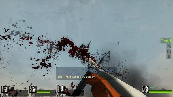 A visual glitch on the Chainsaw can be found if the player uses the Chainsaw for a long time against the Infected or on the Survivors, then immediately points upward on the air (without even releasing the button); this causes the stream of blood from the saw to remain whilst the button is held. It will be displayed like the player is hitting an enemy in mid-air. Blood even drops down the floor during this process. However, this stops if the Chainsaw is out of gas or if the player has released the button.