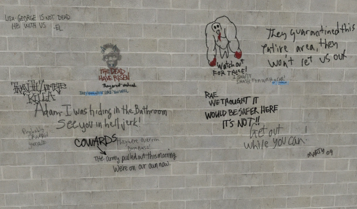 Graffiti is found all over the five campaigns of Left 4 Dead, most commonly within the safe rooms. The graffiti is left by other Survivors who had been through the area. This graffiti generally includes messages, tips, and warnings for loved ones, other Survivors, or simple comments, such is the case with the infamous Chicago Ted. Graffiti tells the story of the game, without cutscenes. Some pieces of graffiti seem to be conversing back and forth.(more...)