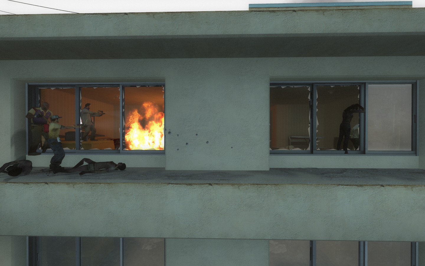 Smokers: Indoors is not prime Smoker territory, to do well here Smokers have to think outside the box. Attempt to grab straggling Survivors to hold up the group or attack any Survivor attempting to rescue a friend from incapacitation, hanging, or another Infected. There are ways, although quite difficult to achieve, to pull Survivors off the edge of the building. If you can drag a Survivor off the edge using the closet that sticks out the side of the building, then just give yourself a pat on the back for doing so. If you hide on the third-highest floor's ledge, you can grab Survivors moving along the edge. If your teammates manage to keep the Survivors there for a while, the Smoker can pull down more than one Survivor. However, downstairs in the fire is your best place, as dragging Survivors into the flames will have dire consequences to both the victim and the rescuer, especially if you managed to down your target.