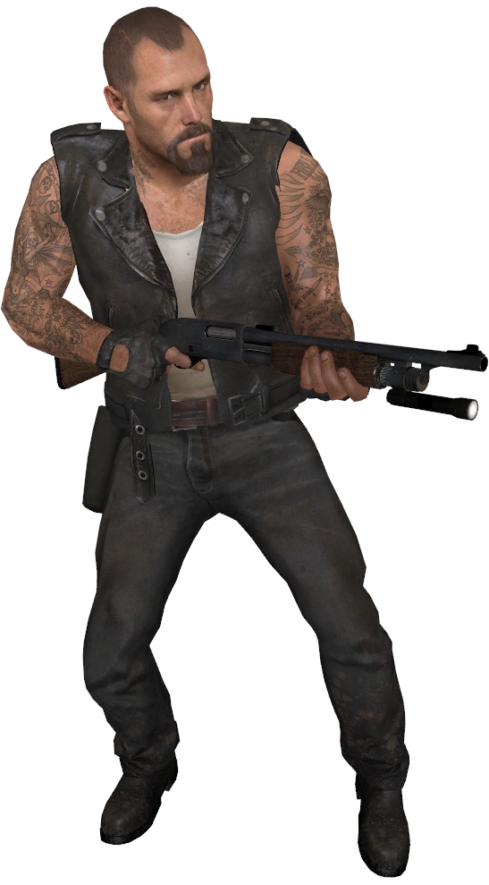 He wears a black leather vest over a white tank top, fingerless gloves, black jeans, and boots. Valve commentary reveals that he is an impressive 6 feet 5 inches tall (195 cm). Francis has a self-centered personality that seems to resent aspects of Bill's leadership whilst treating Louis with an openly dismissive attitude at times. During development, his character was to have a love interest in Zoey, but this was dropped after play-testing and his relationship with her is now warm―if not neutrally platonic. In official media, he is usually seen wielding either the Pump Shotgun or the Auto Shotgun, and in-game, prefers those types of weapons.