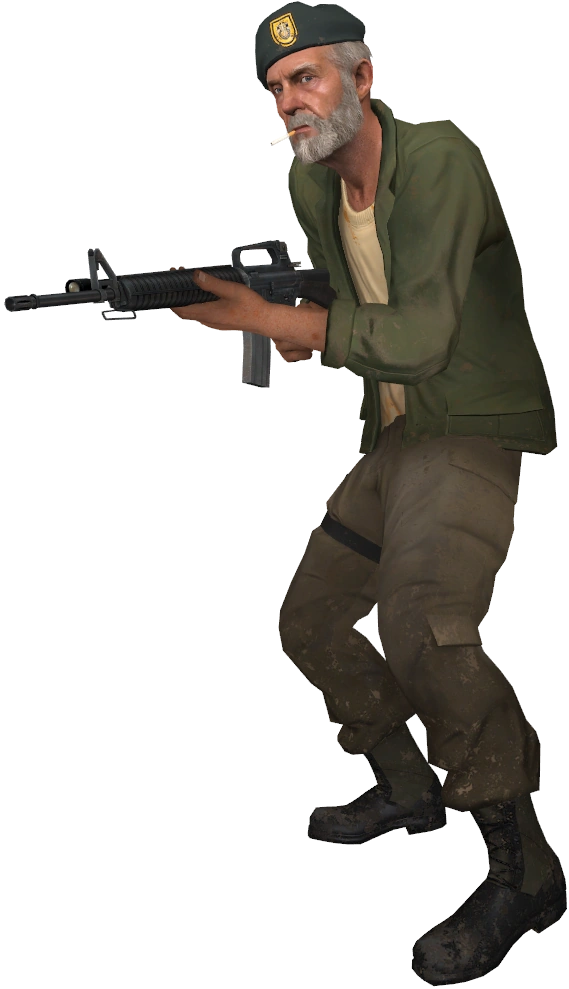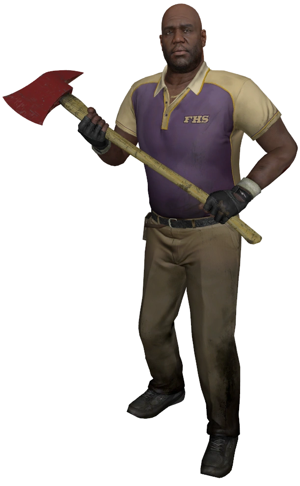 He is the oldest of the Left 4 Dead 2 group and serves in an unofficial capacity as its leader. He is a religious man, stopping the Survivors for a group prayer before entering Liberty Mall, and shows his weak point to be his stomach — always ready to stop when a food joint is nearby. In-game, he shows a preference for Tier 1 and Tier 2 shotguns, while in official media the Chainsaw appears to be his signature weapon.