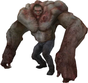 The Tank's body is covered with numerous scars and lesions from previous fights, with an especially large open sore on his left pectoral. The Tank's jaw at first glance seems to be missing, but upon closer inspection it is shown to be enveloped within his thick neck muscles.[2] It can be assumed his bones have become stronger too, otherwise the Tank's skeleton would have collapsed under the weight of his own body; this is supported by that shooting the Tank's head will not put him down any quicker, hinting that the reinforced bone of skull has prevented the projectiles from penetrating.
